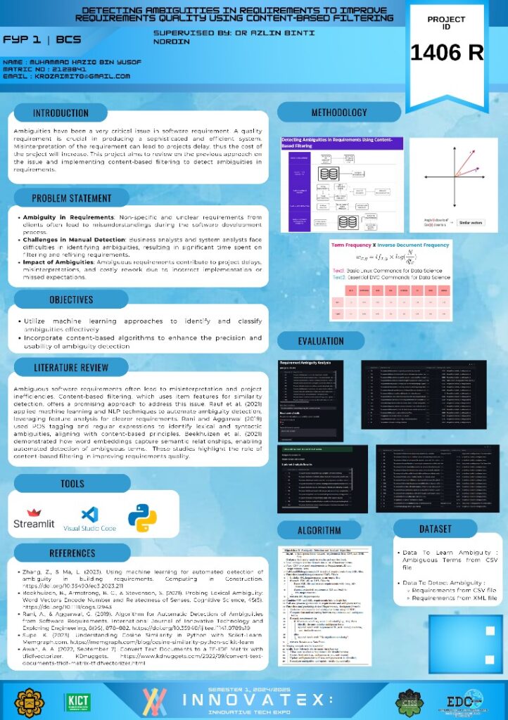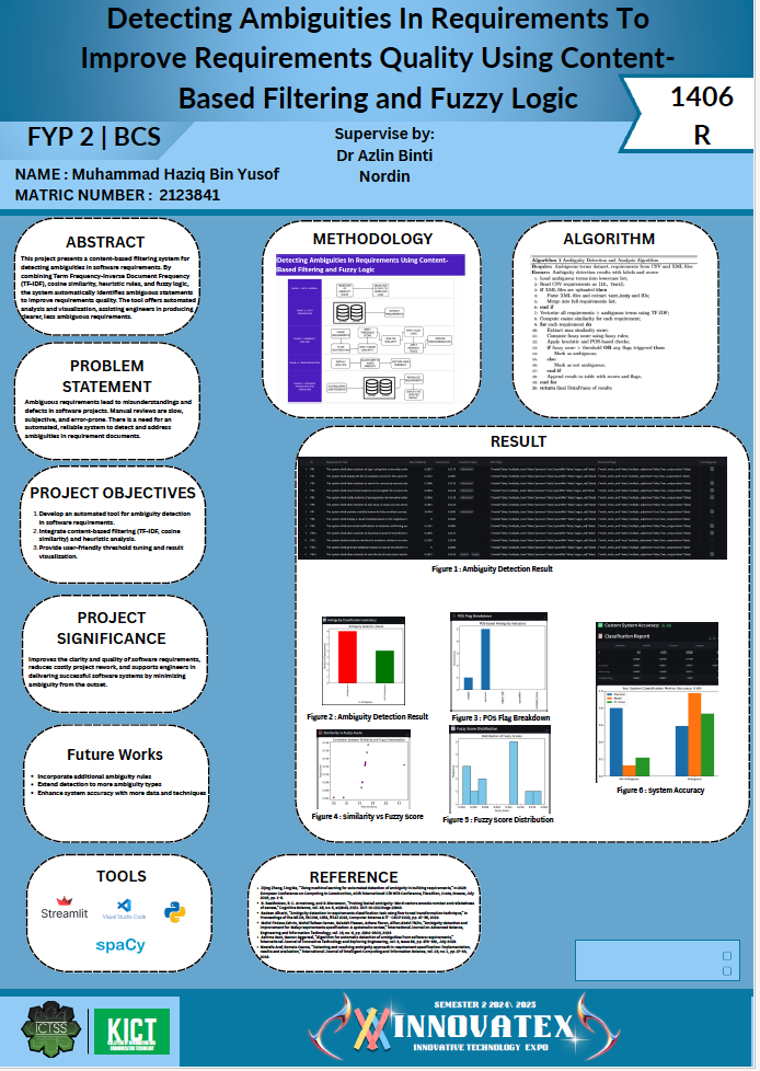 2. | DETECTING AMBIGUITIES IN REQUIREMENTS TO IMPROVE REQUIREMENTS QUALITY USING CONTENT-BASED FILTERING | MUHAMMAD HAZIQ BIN YUSOF (2123841) | – |