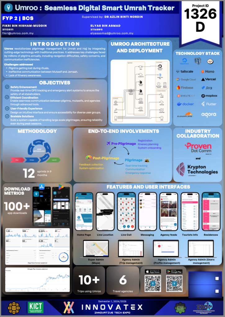 1. | UMROO | FIKRI BIN BISHAM-MUDDIN (2112011) ELYAS BIN ASMAD (2116893) | Hisham-muddin, F., Asmad, E., & Nordin, A. (2025). Umroo: a seamless digital smart umrah tracker. Journal of Advanced Research in Computing and Applications, 39(1), 11-27. https://doi.org/10.37934/arca.39.1.1127 |